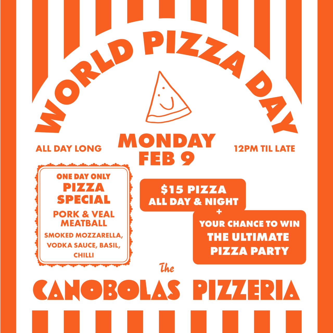 We’re slinging $15 pizzas all day and night, plus a one-day-only pizza special you won’t want to miss.