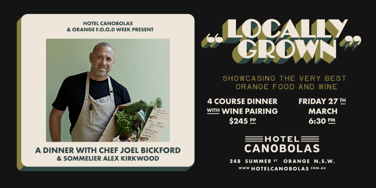 The event will feature food by Chefs Joel Bickford and Danny Corbett, and will showcase some of the best wine and raw produce the Central West has to offer.